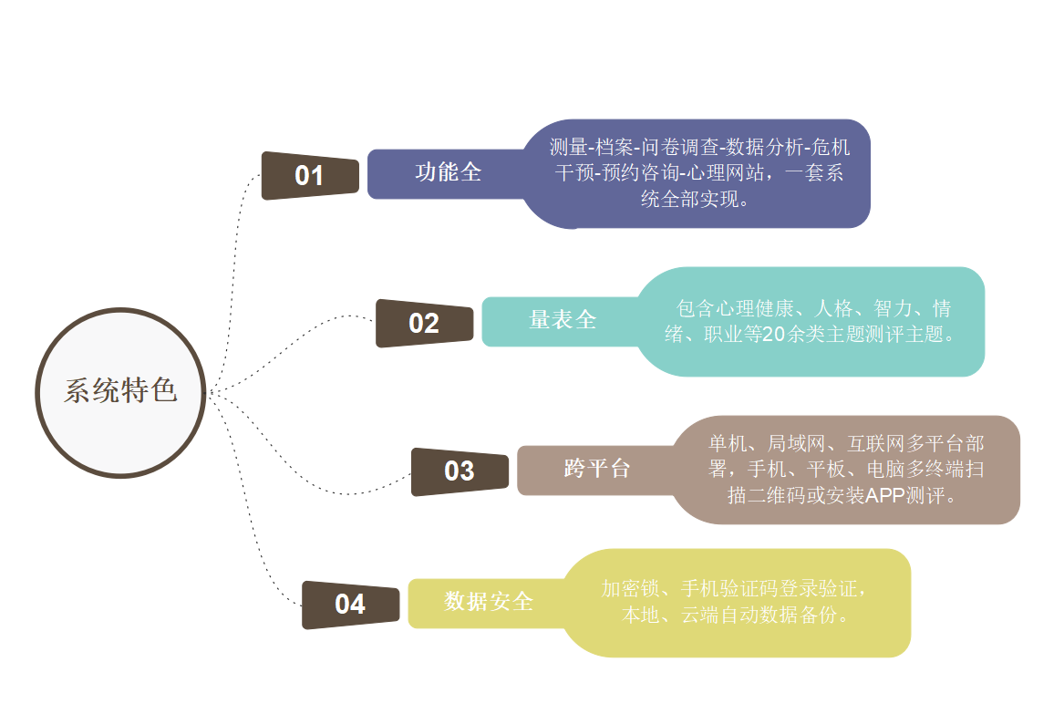 移動(dòng)心理測(cè)評(píng)系統(tǒng)采用云測(cè)評(píng)、云計(jì)算、云儲(chǔ)存、云備份的云數(shù)據(jù)安全規(guī)范,免安裝免維護(hù),在手機(jī)、平板、PC端全網(wǎng)絡(luò)應(yīng)用,高效實(shí)現(xiàn)心理測(cè)評(píng)、心理危機(jī)預(yù)警篩查和心理檔案建立的需求。