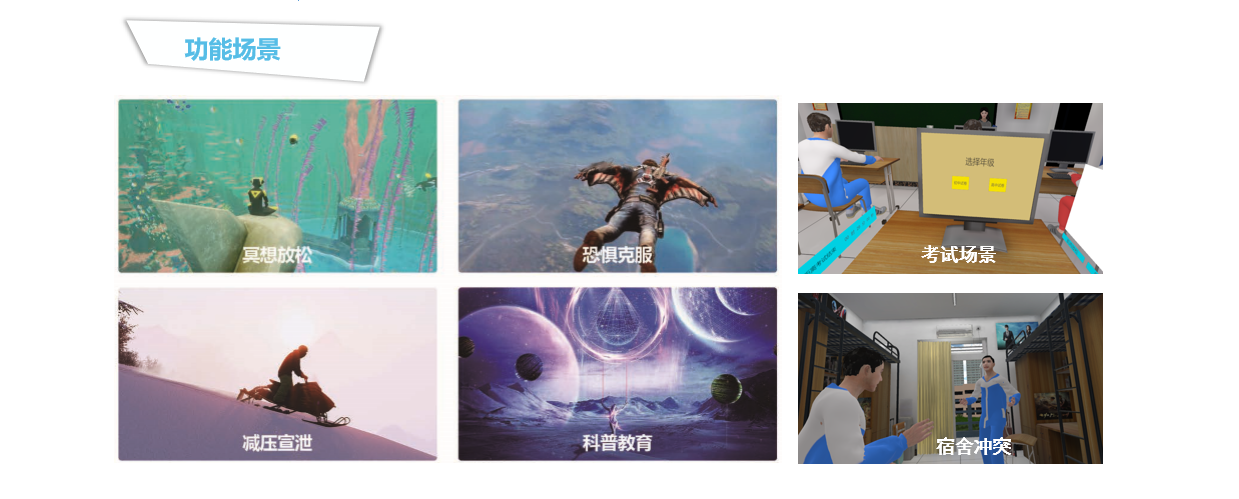 VR虛擬現(xiàn)實(shí)訓(xùn)練系統(tǒng)是一款以虛擬現(xiàn)實(shí)技術(shù)、暴露療法和冥想治療等手段與原理為基礎(chǔ)的集軟硬件于體的智能型專業(yè)放松設(shè)備。它通過構(gòu)建沉浸度較高的虛擬現(xiàn)實(shí)環(huán)境,呈現(xiàn)實(shí)時(shí)的虛擬現(xiàn)實(shí)場(chǎng)景,讓使用者獲得高度的在場(chǎng)感和體驗(yàn)感,并與虛擬空間實(shí)時(shí)交互,在一個(gè)安全可控的環(huán)境內(nèi)反復(fù)練習(xí),大膽探索, 對(duì)改善心理健康水平、提高心理素質(zhì)有著明顯效果,是治療緊張焦慮、恐懼癥、創(chuàng)傷后遺癥、自閉癥和抑郁癥等疾病的創(chuàng)新性手段。