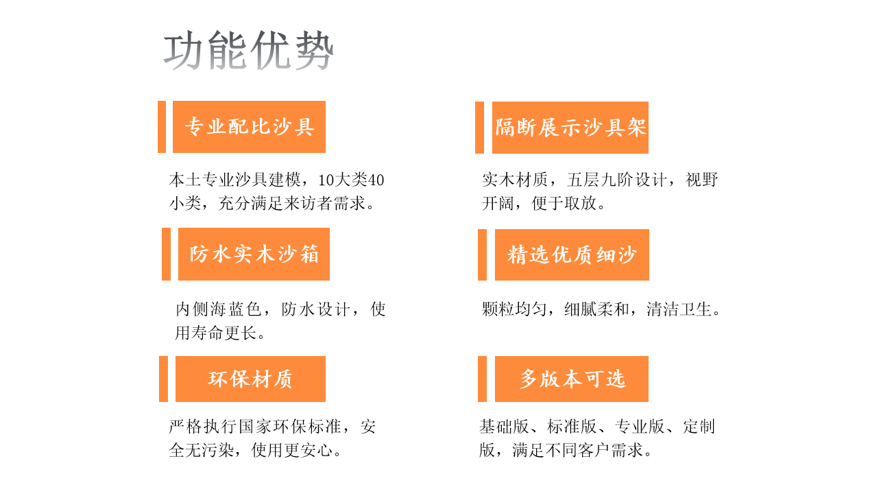 ◆專業(yè)配比沙具:本土專業(yè)沙具建模,10大類40小類,充分滿足來訪者需求。